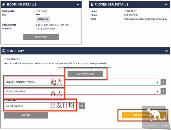 购票后,您的预订码和PIN码会通过预留邮箱发送给您,收到后登录灰狗巴士官网:https://www.greyhound.com.au/,在首页上选择MANAGE BOOKING选项卡,输入预订号码和PIN码,点击【LOGIN】按钮,即可进入管理界面,如下图所示。