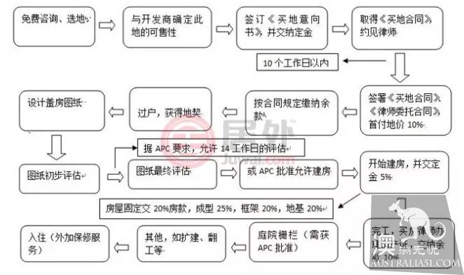 总的来说,买地自己造房的相关流程步骤图示意如下:(而第二种方式的自建房,则会减少很多部分,与购买楼花相似,但也需要自己选地,选户型。)
